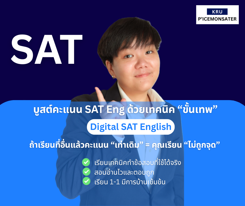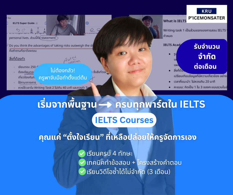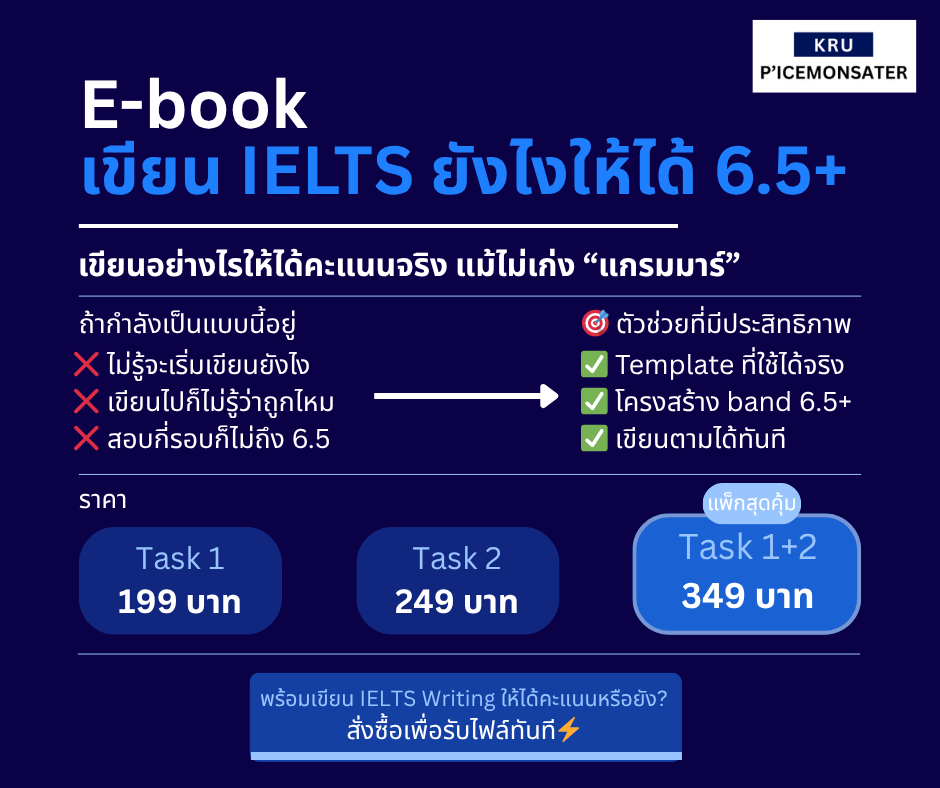 COURSES ครูสอนอะไรบ้าง? นี่คือคอร์สเรียนของครูพี่ไอซ์ค่ะ IELTSคอร์ส IELTS ตัวจบ เจาะลึกเรื่องที่คุณอาจจะ "ไม่เคยรู้" SAT Englishคอร์ส SAT English กับวิธีทำข้อสอบ "ขั้นเทพ" คอร์สภาษาอังกฤษอื่น ๆCU-TEP, TU-GET, A-Level, TGAT, TOEIC, LanguageCert GEDคอร์ส GED ที่ครูตั้งใจสอนเพราะไม่ได้อยากให้แค่นักเรียน "สอบผ่าน" แต่ต้อง "เก่งขึ้นจริง" E-book IELTS Writing Ultimateอีบุ๊คสอนเขียน IELTS Writing Task 1 และ 2 แบบ "ทำตามได้จริง" คอร์ส IELTS ฟรีครบทุกทักษะ ครูตั้งใจสอนมากค่ะ สมัครเรียนเลย!